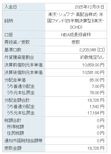 年始にNISAの成長投資枠で楽天SCHDを240万円分一括購入しています。