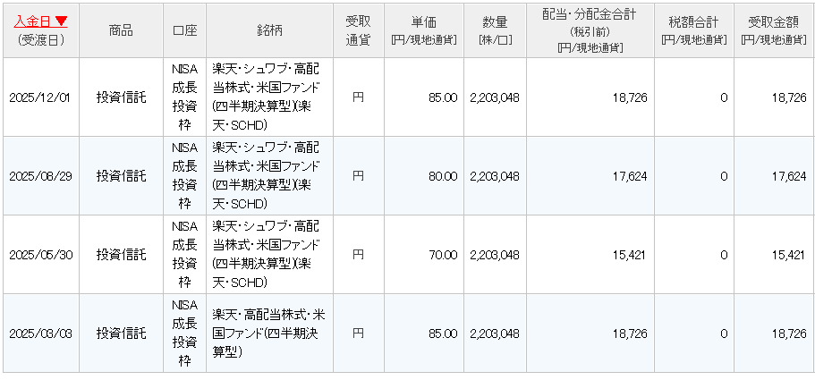 2025年は全4回の分配金をもらい合計70,497円でした。