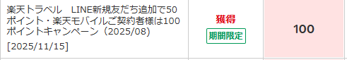 8月にやってたキャンペーンで楽天トラベルLINEと新規友達追加で100ptゲット。(楽天モバイル以外の方は50ptです。)