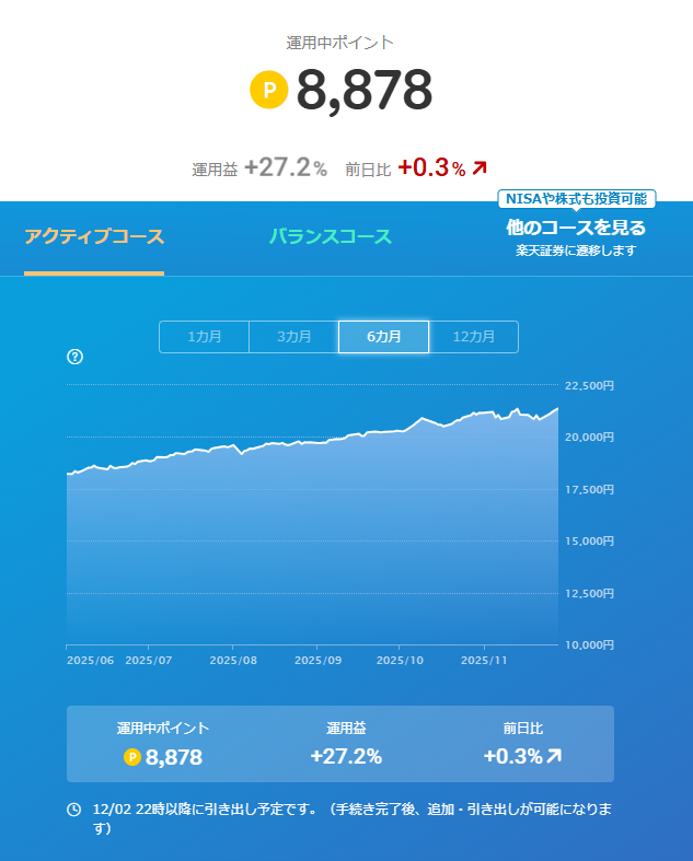 先日全部引き出し手続きしたので、近日中にポイント運用は0ptになる予定です。