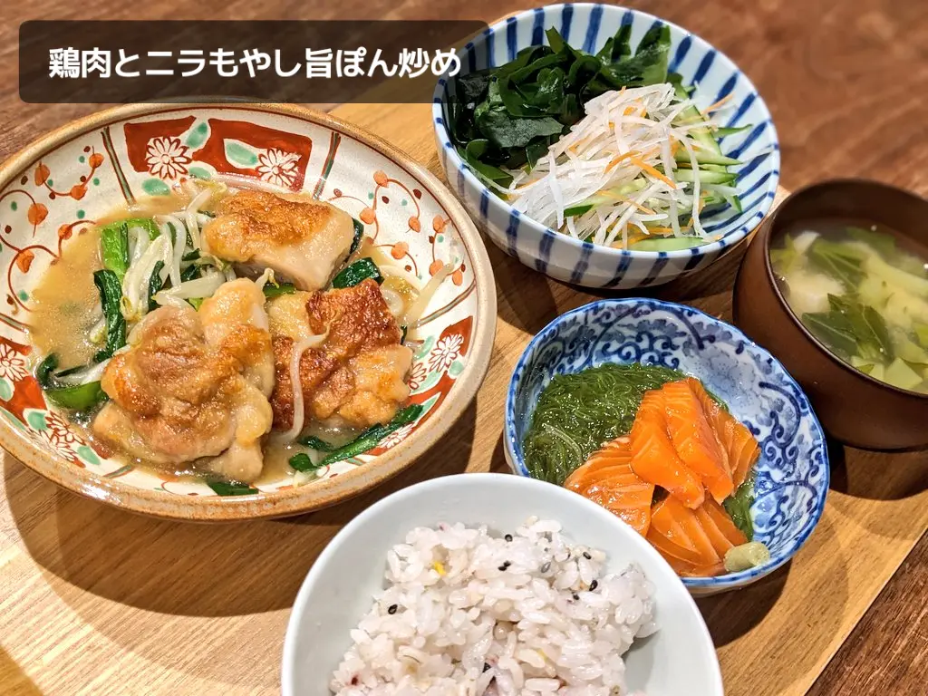 - 鶏肉とニラもやしの旨ぽん酢炒め
