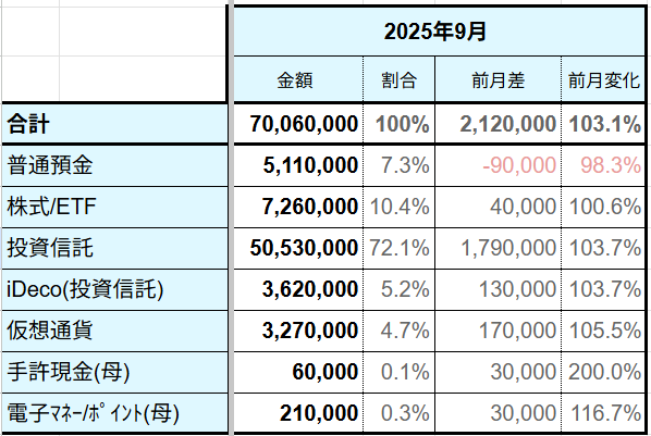 7,000万を超える・2025月9月の資産状況
