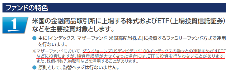 これが明確にSCHDに投資すると謳っている楽天SCHD、SBI・SCHDとの違いでしょうか。