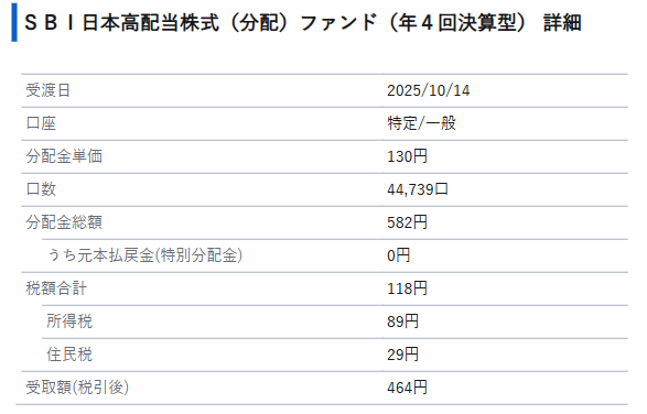 SBI 日本高配当株式(分配)ファンド(年4回決算型) (愛称:SBI日本シリーズ – 日本高配当株式(分配))の分配金が出ました。