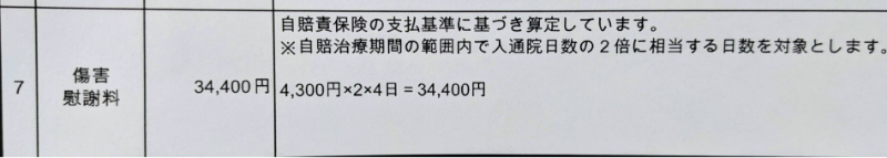 障害が残ったりすると、またいろいろと支払われるのですが、そういったものもなかったので、単純に4回通院で、34,400円でした。