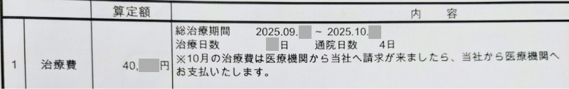 治療費は保険会社が直接病院へ支払うので、私はただ先生の指示に従って治るまで病院に通うだけで、窓口の支払いはありません。