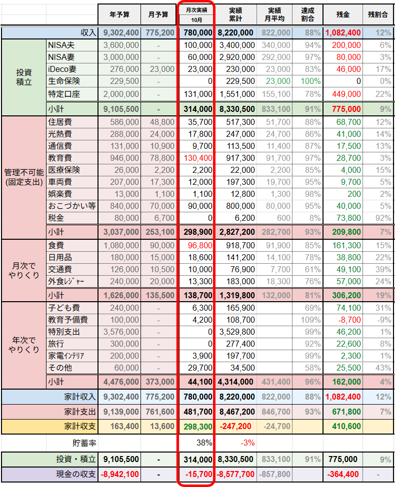 修学旅行費の引落しあり・2025年10月の家計簿まとめ
