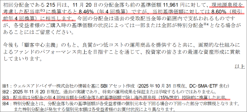 初回分配金である215円は、11月20日の分配金落ち前の基準価額11,961円に対して、現地源泉税を考慮した配当率※3に換算すると8.46%(年4回換算)ですが、当初基準価額に対しては8.60%(税引前年4回換算)に相当します。