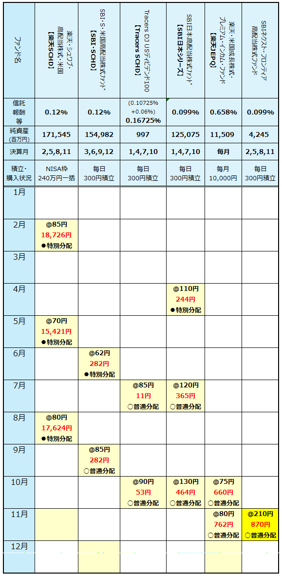 11月の分配金3回ですが、残るは来週11/25の楽天SCHDのみ。