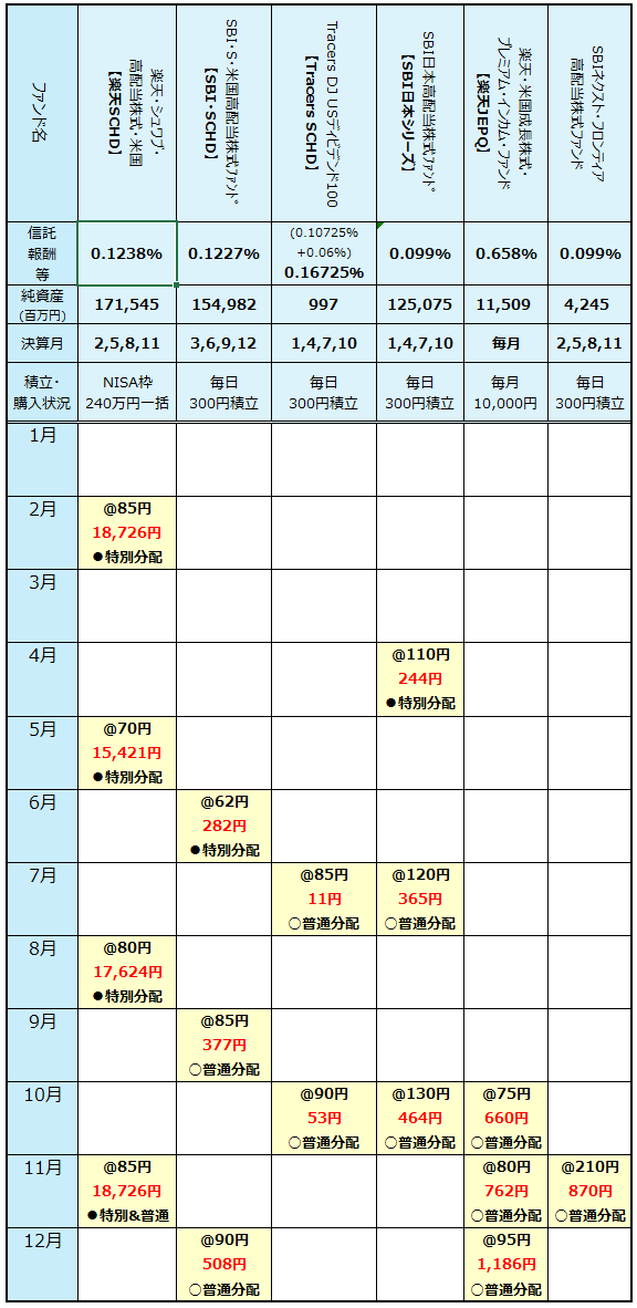 毎月配当金生活にあこがれている私が、購入している高配当株式ファンドの分配金スケジュールはこちら。