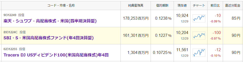 現在、SCHDに投資できるファンドは他にもあります。そのなかでもSBI・SCHDは設定のタイミングが悪かったので一番価格が上がってないです。