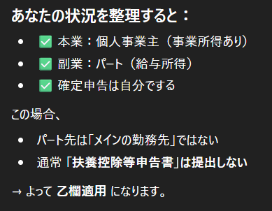 事業所得がありそっちが本業であることをお知らせすると、「じゃあ乙かな」ということになりました。