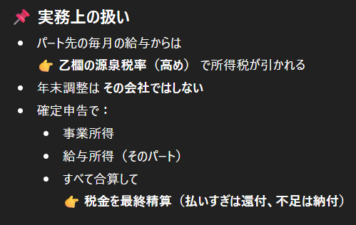 ふむふむ。ええと、乙欄だと年末調整はしないですべて自分で確定申告となる模様です。