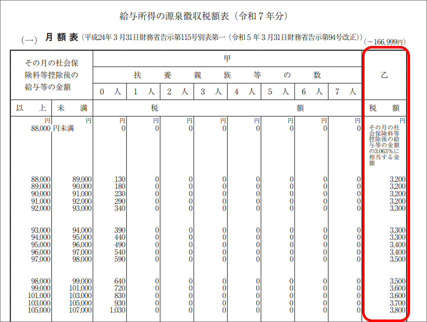 👇🏻乙欄の源泉徴収額(=給与から天引きされる所得税)はこちら
