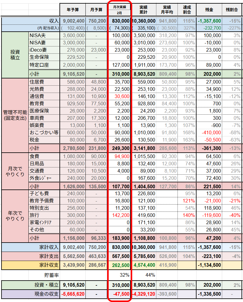 以上、我が家の2月の家計簿でした。