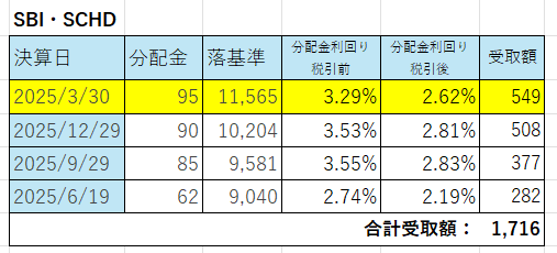 SBI・SCHDの分配金受取額