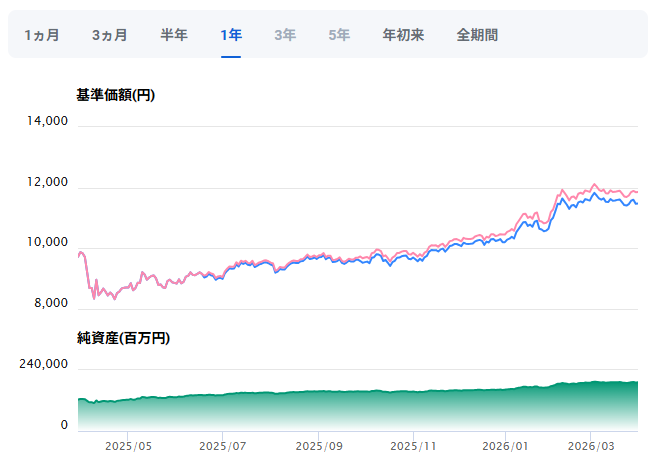 また、3月末にかけてドル円が160円近くまで円安が進んでいたことも、実は地味にプラスに働いています。このファンドは為替ヘッジなしなので、円安になるほど基準価額の下落が和らぐ仕組みになっています。