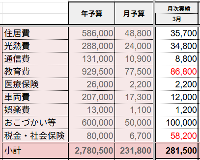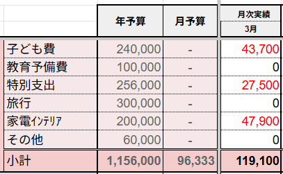 お小遣いは歩合制なので良いとして、教育費や子ども費はことごとく赤字。