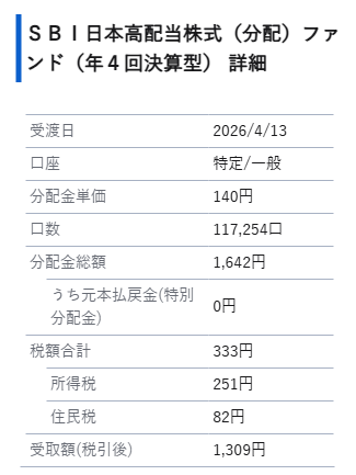 SBI 日本高配当株式(分配)ファンド(年4回決算型) (愛称:SBI日本シリーズ – 日本高配当株式(分配))の分配金が出ました。