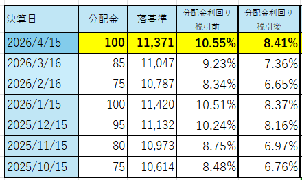 そんな波乱の1ヶ月を経て、昨日(4月15日)の決算では分配金100円・分配落ち後の基準価額11,371円という結果に。
