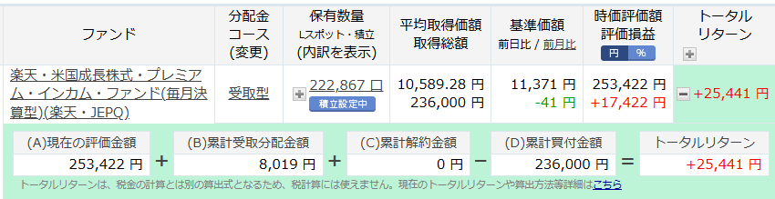 楽天・米国成長株式・プレミアム・インカム・ファンド(毎月決算型) (愛称:楽天・JEPQ)の7回目の分配金が出ました。分配金利回りや現状でのトータルリターンをまとめてみたいと思います。